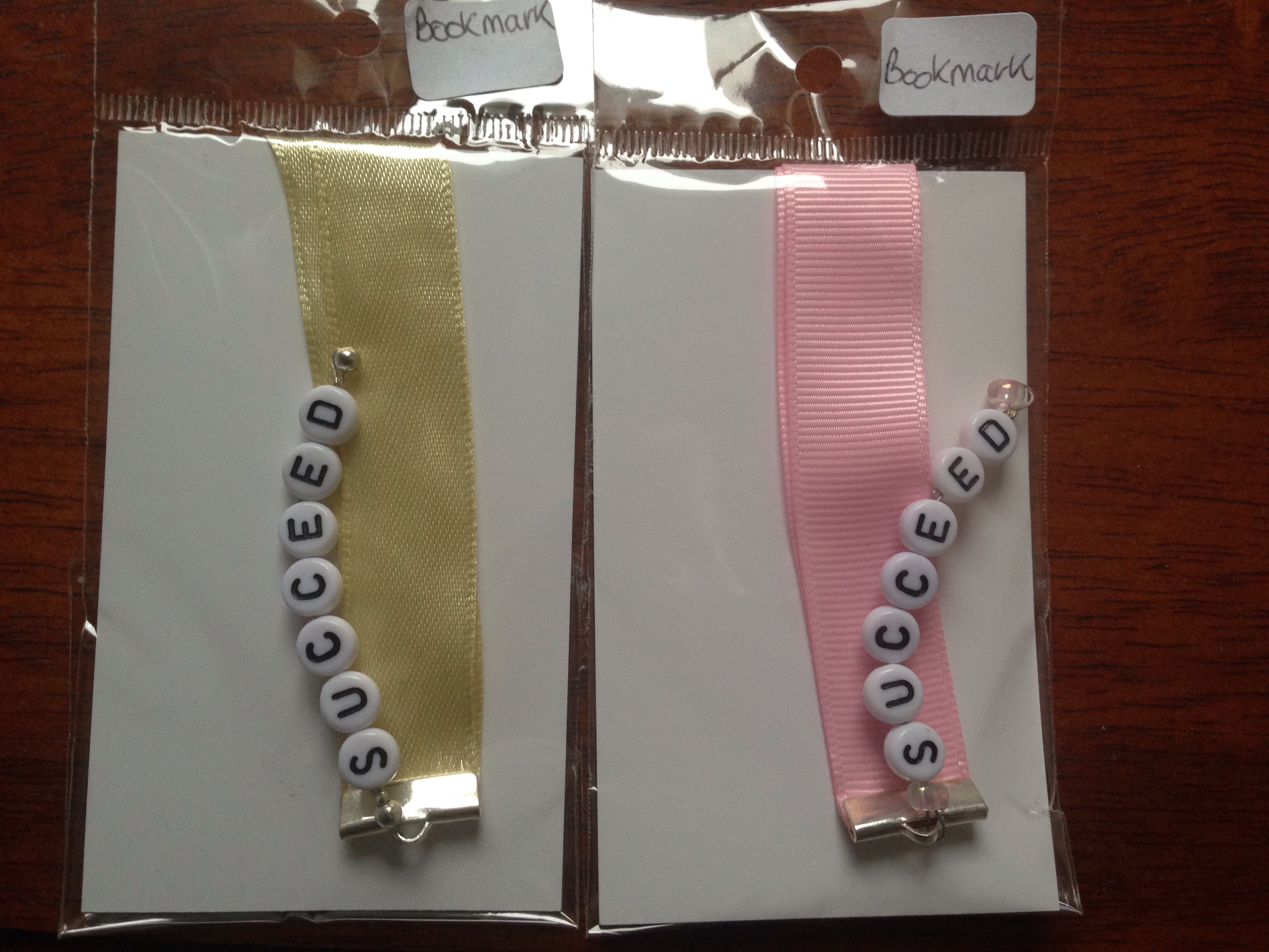 I had some letters left over and some ribbon from something else and so I bought some ribbon ends and made these cute bookmarks. They are a long loop of ribbon in either pink gros grain or smooth silk and could be looped around anything such as a loop on a bag (though not pulled on). The card is from my recently closed business HUNO.